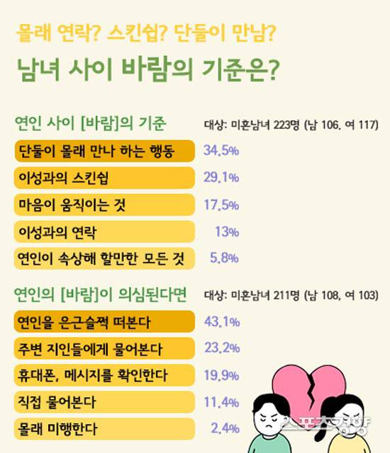 8월 12일부터 23일까지 진행한 또 다른 설문을 통해 미혼남녀 223명(남 106, 여 117)이 ‘남녀 사이 바람의 기준’도 함께 조사했다. ‘밥, 술 등 단둘이 몰래 만나 하는 활동(34.5%)’이 1위로 나타났다.
