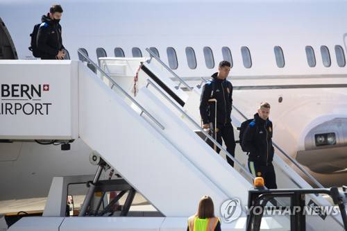 epa09465491 Manchester United's Cristiano Ronaldo (C) and teammates disembark from the plane upon their team's arrival at the airport in Bern-Belp, Switzerland, 13 September 2021. Manchester United will face Young Boys Bern in their UEFA Champions League group F soccer match on 14 September 2021. EPA/PETER KLAUNZER