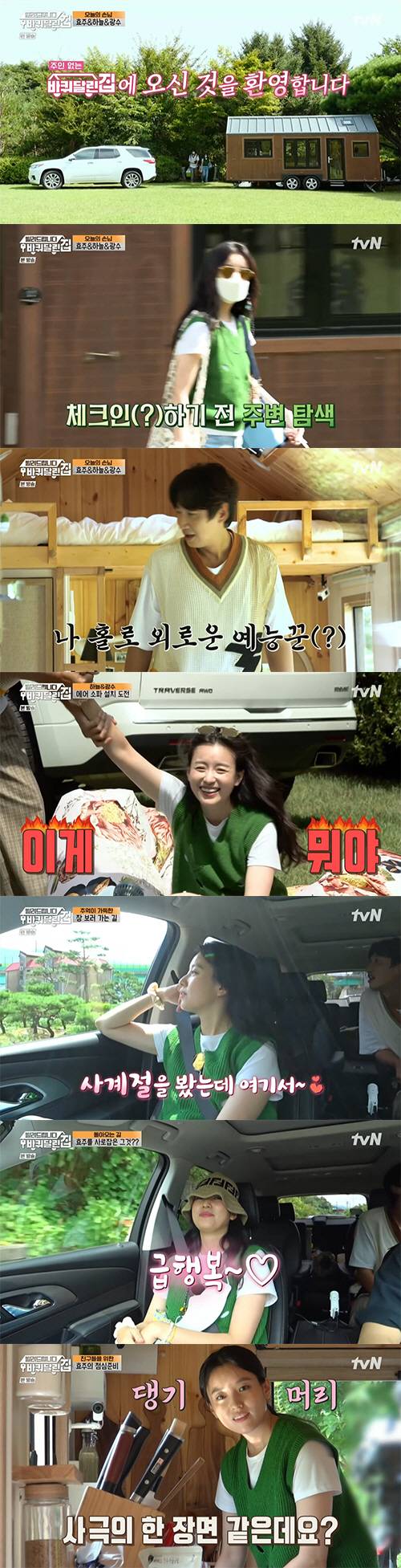 세 사람은 나무 사이로 보이는 '바퀴 달린 집'을 발견하자 "우와 저기다"라며 신기해 했다. 한효주는 "일단 들어가 보자"라고 이야기했다. 특히 한효주는 "오늘 저녁 먹을 고기와 반찬을 가져왔다"라며 큰손 면모를 보였다.