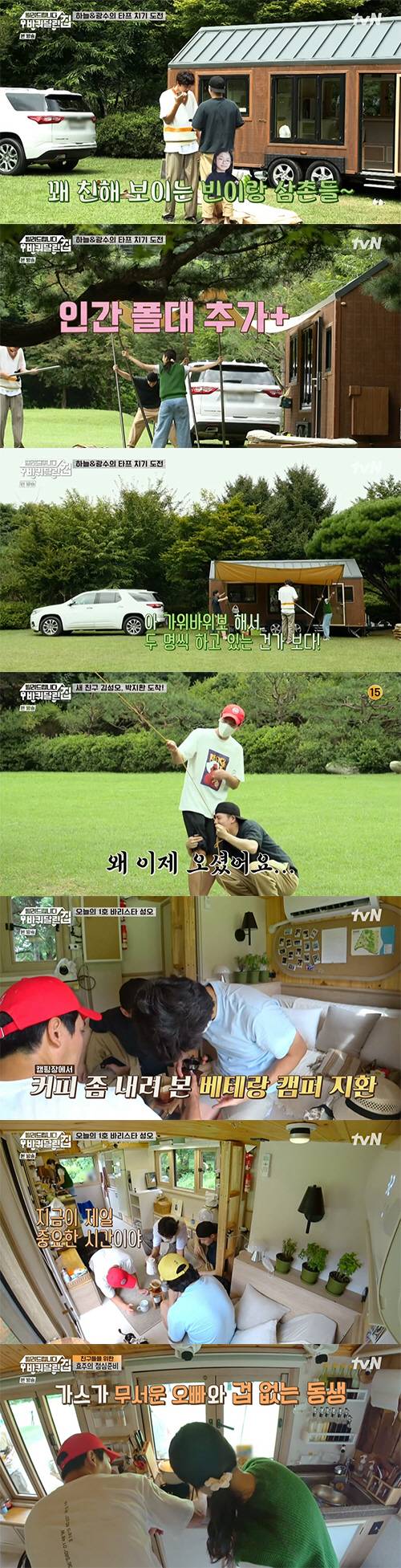 성동일에게 타프 치는 법을 열심히 듣고 두 사람은 배운대로 타프를 치기 시작했지만 생각대로 칠 수없어 난관에 봉착했다. 두 사람은 "손으로 들고 있어야하는 건가"라며 폴대를 잡고 서있는 모습을 보였다. 또 점심을 준비하던 한효주까지 불러 폴대를 잡고 있으라고 이야기해 웃음을 더했다.