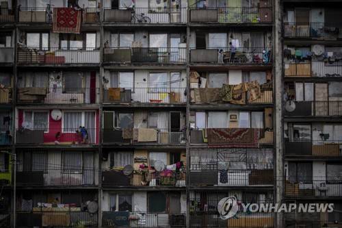 epa09465562 People look out from Roma settlement at Lunik IX district with a large billboard showing an image of Pope Francis, day before Pope Francis visit, in Kosice, Slovakia, 13 September 2021. Pope Francis is on a three-day visit to Slovakia under the official motto: 'With Mary and Joseph on the way to Jesus'. EPA/MARTIN DIVISEK