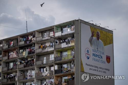 epa09465566 People look out from Roma settlement at Lunik IX district with a large billboard showing an image of Pope Francis, day before Pope Francis visit, in Kosice, Slovakia, 13 September 2021. Pope Francis is on a three-day visit to Slovakia under the official motto: 'With Mary and Joseph on the way to Jesus'. EPA/MARTIN DIVISEK