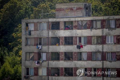 epa09465570 People look out from Roma settlement at Lunik IX district, day before Pope Francis visit, in Kosice, Slovakia, 13 September 2021. Pope Francis is on a three-day visit to Slovakia under the official motto: 'With Mary and Joseph on the way to Jesus'. EPA/MARTIN DIVISEK