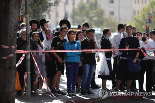 epa09465583 People at the scene of a stabbing attack in a store in Jerusalem, Israel, 13 September 2021. A Palestinian was shot by Israeli forces for allegedly stabbing two Israelis, according to the Israeli police. EPA/ABIR SULTAN
