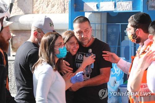epa09465581 Eyewitnesses at the scene of a stabbing attack in a store in Jerusalem, Israel, 13 September 2021. A Palestinian was shot by Israeli forces for allegedly stabbing two Israelis, according to the Israeli police. EPA/ABIR SULTAN
