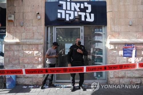 epa09465587 Israeli police at the scene of a stabbing attack in a store in Jerusalem, Israel, 13 September 2021. A Palestinian was shot by Israeli forces for allegedly stabbing two Israelis, according to the Israeli police. EPA/ABIR SULTAN