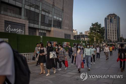 epa09465594 People wearing protective face masks walk during an evening rush hour amid the coronavirus pandemic in Beijing, China, 13 September 2021. China's National Health Commission reported 49 Covid-19 cases in the mainland for 12 September, including 22 locally transmitted cases in south-eastern Fujian province. EPA/ROMAN PILIPEY