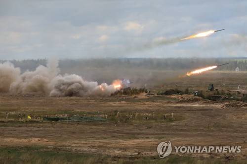 epa09465603 A handout photo made available by the Russian Defence ministry press service shows Russian BM-21 'Grad', a Soviet truck-mounted 122 mm multiple rocket launcher, fire during the Zapad-2021 (West-2021) joint Russian-Belarusian drills on the Mulino training ground in the Nizhny Novgorod region, Russia, 13 September 2021. The exercises take place in Russia and Belarus from 10 to 16 September. the Russian Ministry of Defense said that the Zapad-2021 (West-2021) military exercises will be defensive in nature. Up to 200 thousand personnel, about 80 aircraft and helicopters, up to 760 units of military equipment, including 290 tanks, 240 guns, multiple launch rocket systems and mortars, as well as up to 15 ships take part in the exercises on the territory of the Russian Federation and Belarus. EPA/RUSSIAN DEFENCE MINISTRY PRESS SERVICE/HANDOUT HANDOUT EDITORIAL USE ONLY/NO SALES