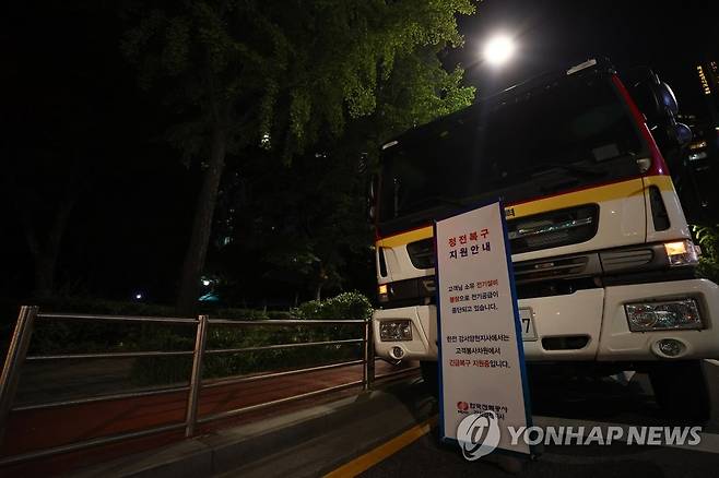 (서울=연합뉴스) 류영석 기자 = 13일 오후 1천300여세대에 정전이 발생한 서울 양천구 목동의 한 아파트 단지 앞에 한국전력 차량이 주차되어 있다. 2021.9.13