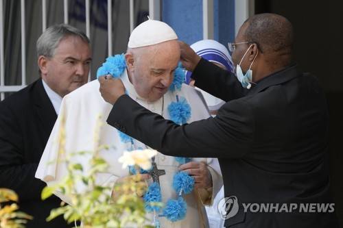 Pope Francis is welcomed as he visits the Bethlehem center for the homeless in Bratislava, Slovakia, Monday, Sept. 13, 2021. Francis is on a four-day visit to Central Europe, in Hungary and Slovakia, in his first big international outing since undergoing intestinal surgery in July. (AP Photo/Gregorio Borgia)