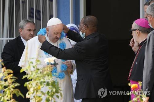 Pope Francis is welcomed as he visits the Bethlehem center for the homeless in Bratislava, Slovakia, Monday, Sept. 13, 2021. Francis is on a four-day visit to Central Europe, in Hungary and Slovakia, in his first big international outing since undergoing intestinal surgery in July. (AP Photo/Gregorio Borgia)