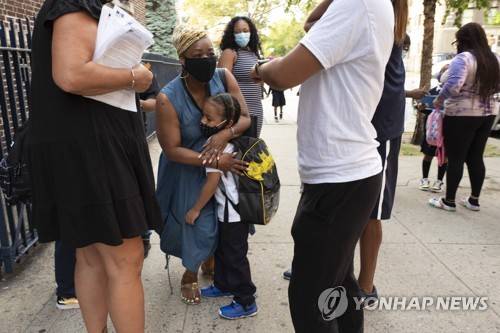 A boy gets a hug as he arrives for the first day of school at Brooklyn's PS 245, Monday, Sept. 13, 2021 in New York. Classroom doors are swinging open for about a million New York City public school students in the nation's largest experiment of in-person learning during the coronavirus pandemic. (AP Photo/Mark Lennihan)