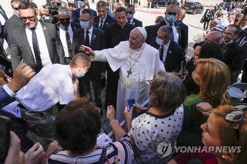 Pope Francis blesses an unidentified man as he greets the crowd while leaving the Cathedral of Saint Martin, in Bratislava, Slovakia, Monday, Sept. 13, 2021. Francis is on a four-day visit to Central Europe, in Hungary and Slovakia, in his first big international outing since undergoing intestinal surgery in July. (AP Photo/Petr David Josek)