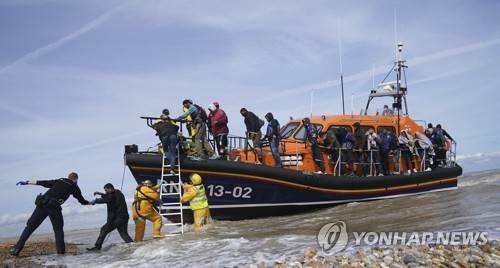 Members of the RNLI assist a group of people thought to be migrants after they were brought into Dungeness, Kent, by an RNLI lifeboat following a small boat incident in the Channel, in England, Monday, Sept. 13, 2021. (Gareth Fuller/PA via AP) UNITED KINGDOM OUT NO SALES NO ARCHIVE PHOTOGRAPH CANNOT BE STORED OR USED FOR MORE THAN 14 DAYS AFTER THE DAY OF TRANSMISSION