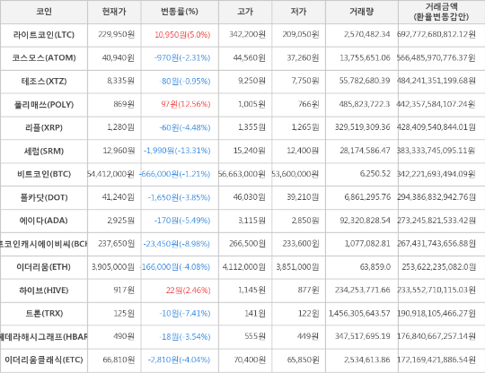 또한, 라이트코인(5.0%, 229,950원), 하이브(2.46%, 917원)가 상승세를 나타냈다.