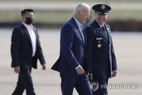President Joe Biden is escorted by Col. William McDonald the Vice Commander of the 89th Airlift Wing, as he walks from Marine One before boarding Air Force One, Monday, Sept. 13, 2021, at Andrews Air Force Base, Md. (AP Photo/Luis M. Alvarez)
