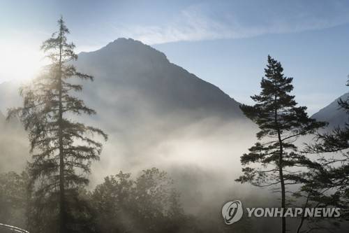 epa09465607 Fog lies over a landscape of mountains and trees near Innertkirchen, Switzerland, 13 September 2021. EPA/GAETAN BALLY