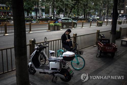 epa09465613 A woman uses her mobile phone in the business district amid the coronavirus pandemic in Beijing, China, 13 September 2021. China's National Health Commission reported 49 Covid-19 cases in the mainland for 12 September, including 22 locally transmitted cases in south-eastern Fujian province. EPA/ROMAN PILIPEY
