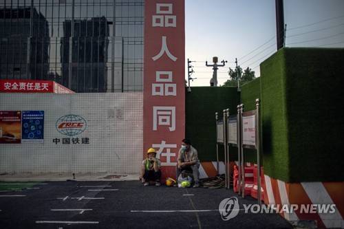 epa09465617 Construction workers smoke on the street, amid the coronavirus pandemic in Beijing, China, 13 September 2021. China's National Health Commission reported 49 Covid-19 cases in the mainland for 12 September, including 22 locally transmitted cases in south-eastern Fujian province. EPA/ROMAN PILIPEY