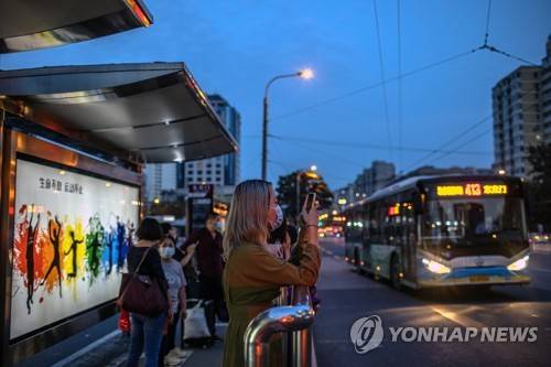 epa09465619 A woman wearing a protective face mask uses her mobile phone while waiting at a bus station during an evening rush hour amid the coronavirus pandemic in Beijing, China, 13 September 2021. China's National Health Commission reported 49 Covid-19 cases in the mainland for 12 September, including 22 locally transmitted cases in south-eastern Fujian province. EPA/ROMAN PILIPEY