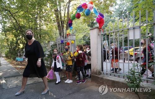 epa09465639 A Romanian teacher (L), followed by her students, enter the school gate during the first school day at the 'Leonardo da Vinci' Secondary School in Bucharest, Romania, 13 September 2021. In Romania, the school year 2021-2022 started on 13 September with physical attendance at classes for approximately 2.9 million students and preschoolers, and with the online presence of 2,400 students from localities affected by the new wave of covid-19. In the context of the increase in the daily number of SARS-CoV-2 infections, measures were taken to protect students' health, parents access to schools was restricted for the first day of school. In the first two months after the start of school, a vaccination campaign will be carried out for children over 12 years old, with Pfizer and Moderna vaccines. Wearing a protective mask by students and teachers is mandatory, both in the school and in its vicinity. EPA/ROBERT GHEMENT
