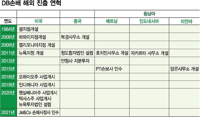 특히 해외 시장 개척 첫 삽을 뜬 괌에서는 DB손보의 시장 점유율이 19.3%로 1위에 오를 정도다. 현지화에 성공했다는 평가를 받는다. 하와이에서는 올해 4월 하와이지역 최대 손해사정사인 '제이엠앤코(JM&Co)'를 인수해 시장지배력을 높였다.