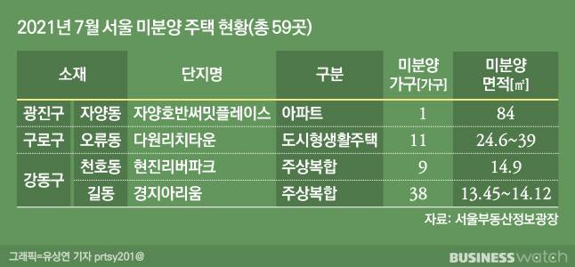 서울부동산정보광장에 따르면 지난달 서울 미분양 주택은 △구로구 오류동 11가구 △강동구 천호동 9가구 △강동구 길동 39가구 △광진구 자양동 1가구 등 총 59가구에 불과한데 이중 자양동 1가구를 빼고는 모두 규모가 작은 도시형생활주택과 초소형 주상복합이었다.