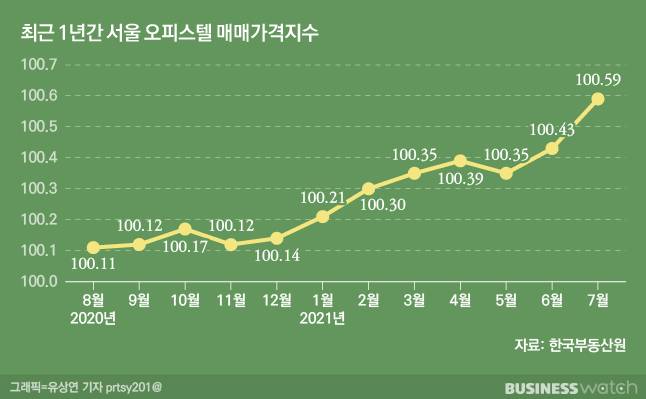 오피스텔도 이미 아파트값 상승으로 인한 풍선효과 등으로 가격이 꾸준히 상승세다. 한국부동산원에 따르면 서울 오피스텔 매매가격지수는 지난해 8월 100.11이었으나 1년 만인 지난 7월 100.59로 0.48포인트 올랐다.