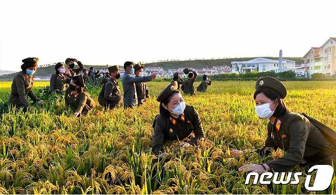 (평양 노동신문=뉴스1) = 북한 노동당 기관지 노동신문은 14일 김정은 당 총비서가 수해를 입은 황해북도 금천군 강북리를 현지지도 한 지 1년이 되는 이날을 기념했다. 사진은 제대병사들이 복구가 완료된 고향의 농작물을 살펴보고 있는 모습.