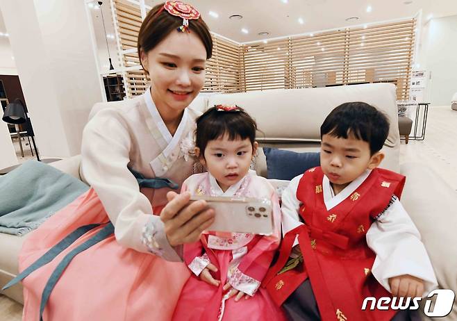 (서울=뉴스1) = 14일 서울 강서구 소재 홈플러스 강서점 일룸 매장에서 모델과 어린이들이 ‘아동 한복 기획전’을 알리고 있다.
