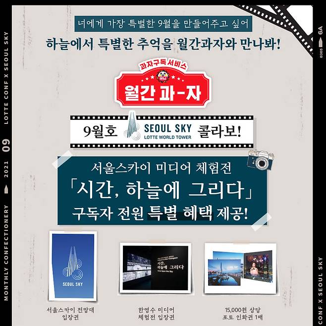 롯데제과는 '월간과자' 9월호를 구독하는 고객에 한해서 한영수 미디어 체험전 관람이 가능한 서울스카이 입장권과 사진 인화권, 총 3종 특별 패키지를 정가 4만2000원에서 2만8000원 할인가에 구입할 수 있는 혜택을 제공한다.