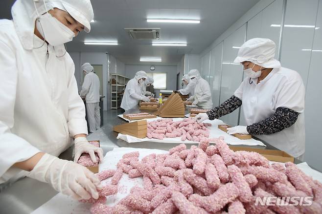 [강릉=뉴시스] 김경목 기자 = 민족 최대의 명절인 추석을 앞둔 14일 오전 전통한과로 유명한 강원도 강릉시 사천면 모래네한과마을 선미한과(대표 김성래)에서 우리과자인 한과를 생산하고 있다. 선미한과에서는 13일로 소비자 주문을 마감했다. 2021.09.14. photo31@newsis.com