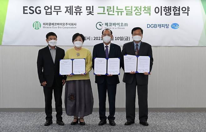DGB캐피탈은 미라클에코바이오, 메코바이오와 ESG 업무제휴·그린뉴딜정책 이행협약을 맺었다고 14일 밝혔다.