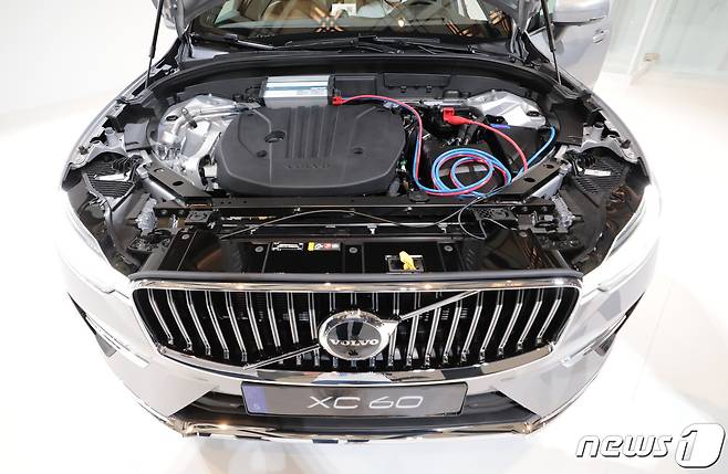 (서울=뉴스1) 이성철 기자 = 14일 서울 용산구 그랜드 하얏트 서울에서 볼보자동차코리아가 국내 최초 통합형 SKT 인포테인먼트 서비스를 탑재한 볼보 신형 XC60을 공개하고 있다. 약 4년만에 선보이는 이번 신형 XC60은 국내 최대의 내비게이션 서비스 티맵(TMAP)과 인공지능(AI) 플랫폼 누구(NUGU), 사용자 취향 기반의 음악 플랫폼 플로(FLO) 등이 기본 탑재된다. 일부 편의사양 및 파워트레인에 따라 3가지 하이브리드 엔진, 5가지 트림으로 출시된다. 2021.9.14/뉴스1