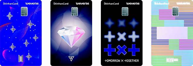 위버스 신한카드는 글로벌 팬 커머스 플랫폼 위버스샵에 입점한 아티스트 팬덤을 위한 상품이다. 하이브 레이블즈 아티스트인 방탄소년단, 세븐틴, 투모로우바이투게더, 엔하이픈 등 4팀 카드 4종으로 구성됐다. 각각 신용·체크카드로 신청이 가능하다.