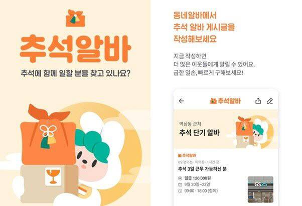 14일 지역기반 커뮤니티 당근마켓에 따르면 추석 단기 아르바이트 공고글을 동네 단위별로 보기 쉽도록 모아 보여주는 '추석 알바' 채널을 오는 26일까지 운영한다.