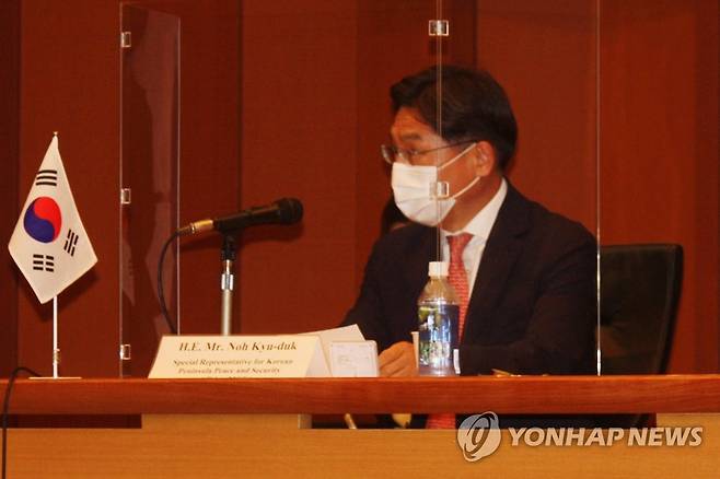 (도쿄=연합뉴스) 김호준 특파원 = 노규덕 한반도평화교섭본부장과 성 김 미국 대북특별대표, 후나코시 다케히로(船越健裕) 일본 외무성 아시아대양주국장이 14일 오전 도쿄 소재 일본 외무성 국제회의실에서 만나 북핵 문제 해결을 위한 3국 간 공조 방안을 협의했다. 한미일 북핵 수석대표 협의 모두발언하는 노규덕 본부장. 2021.09.14