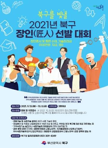 부산 북구(구청장 정명희)는 산업 현장에 종사하는 숙련기술자들이 긍지를 가지고 산업발전과 지역경제 활성화에 이바지할 수 있도록 '2021년 북구 장인(匠人)'을 선정한다고 14일 밝혔다.