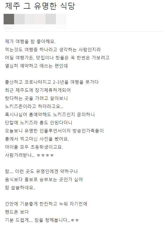 한 온라인 커뮤니티에선 제주에서 장기체류중이라는 네티즌 A씨는 12일 '룸 예약도 노키즈인지 (L레스토랑에) 문의했더니 안된다고 하더라'며 '오늘보니 유명한 인플루언서이자 방송인 가족들이 룸에서 먹고 마신 사진을 봤다. 아이들 모두 초등학생이더라. 사람 가려받나'라고 주장했다. 이어 A씨는 '이런 곳도 유명인에겐 약하구나. 음식보다 홍보로 승부 보는 곳인가 싶어 참 씁쓸하다'고 덧붙이기도 했다.