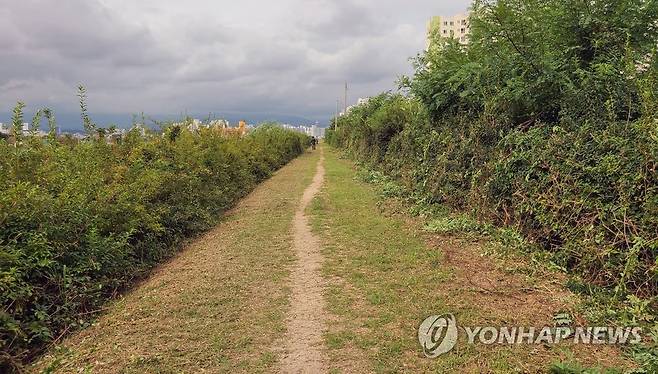 (강릉=연합뉴스) 추석 명절을 앞두고 14일 강원 강릉시 남대천 산책로 주변의 풀을 깎는 작업이 한창이다. 2021.9.14 [강릉시 송정동 주민센터 제공.재판매 및 DB 금지]