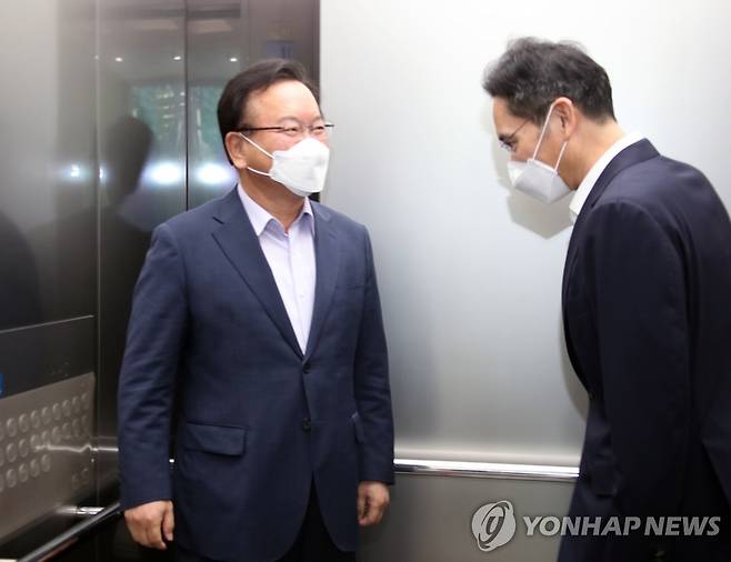 (서울=연합뉴스) 김승두 기자 = 김부겸 국무총리가 14일 서울 서초구 '삼성 청년 소프트웨어 아카데미(SSAFY)' 교육 현장을 방문, 이재용 삼성전자 부회장을 만나 인사하고 있다. 이 부회장은 지난달 13일 가석방으로 출소한 뒤 첫 공식 외부일정이며 김 총리는 제2회 청년의 날(9월18일)을 기념해 11일부터 18일까지 청년주간을 운영하고 청년 일자리 현장과 문화 행사 등에 참석하고 있다. 2021.9.14