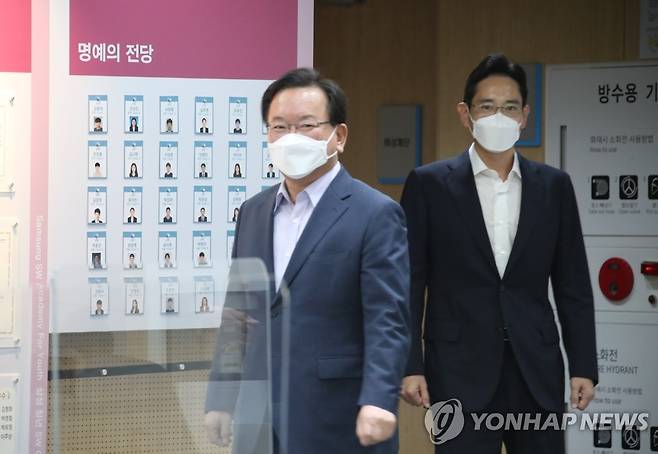 (서울=연합뉴스) 김승두 기자 = 김부겸 국무총리(왼쪽)가 14일 서울 서초구 '삼성 청년 소프트웨어 아카데미(SSAFY)' 교육 현장을 방문, 이재용 삼성전자 부회장과 입장하고 있다. 이 부회장은 지난달 13일 가석방으로 출소한 뒤 첫 공식 외부일정이며 김 총리는 제2회 청년의 날(9월18일)을 기념해 11일부터 18일까지 청년주간을 운영하고 청년 일자리 현장과 문화 행사 등에 참석하고 있다. 2021.9.14