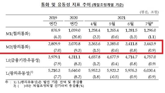 한국은행이 14일 공개한 '통화 및 유동성' 통계에 따르면 7월 광의 통화량(M2 기준)은 3,443조 9천억 원으로, 6월보다 32조 1천억 원(0.9%) 늘었다.