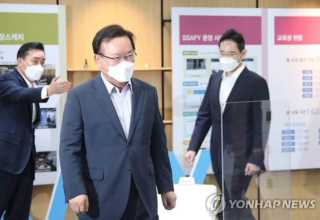 (서울=연합뉴스) 김승두 기자 = 김부겸 국무총리(가운데)가 14일 서울 서초구 '삼성 청년 소프트웨어 아카데미(SSAFY)' 교육 현장을 방문, 이재용 삼성전자 부회장(오른쪽)과 참석하고 있다. 이 부회장은 지난달 13일 가석방으로 출소한 뒤 첫 공식 외부일정이며 김 총리는 제2회 청년의 날(9월18일)을 기념해 11일부터 18일까지 청년주간을 운영하고 청년 일자리 현장과 문화 행사 등에 참석하고 있다. 2021.9.14
