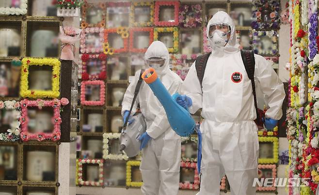 [수원=뉴시스] 김종택기자 = 민족 대명절 추석을 일주일 앞둔 14일 오전 경기도 수원시연화장 추모의집에서 수원도시공사 관계자들이 방문객들의 코로나19 예방을 위한 방역을 하고 있다. 수원시연화장은 9월 6일부터 10월 10일까지 사전 예약제로 추모객들을 받으며 미예약자들은 입장 가능 인원수에 따라 입장에 제한이 있을 수 있다. 2021.09.14.