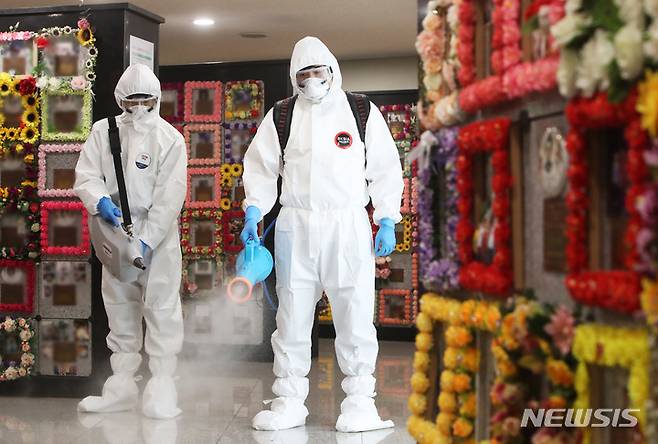 [수원=뉴시스] 김종택기자 = 민족 대명절 추석을 일주일 앞둔 14일 오전 경기도 수원시연화장 추모의집에서 수원도시공사 관계자들이 방문객들의 코로나19 예방을 위한 방역을 하고 있다. 수원시연화장은 9월 6일부터 10월 10일까지 사전 예약제로 추모객들을 받으며 미예약자들은 입장 가능 인원수에 따라 입장에 제한이 있을 수 있다. 2021.09.14.
