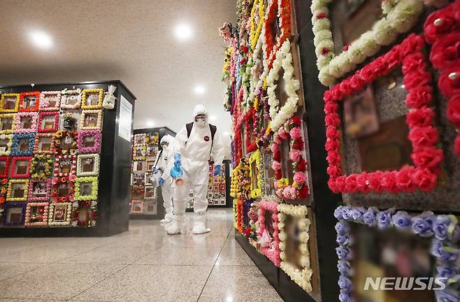 [수원=뉴시스] 김종택기자 = 민족 대명절 추석을 일주일 앞둔 14일 오전 경기도 수원시연화장 추모의집에서 수원도시공사 관계자들이 방문객들의 코로나19 예방을 위한 방역을 하고 있다. 수원시연화장은 9월 6일부터 10월 10일까지 사전 예약제로 추모객들을 받으며 미예약자들은 입장 가능 인원수에 따라 입장에 제한이 있을 수 있다. 2021.09.14.