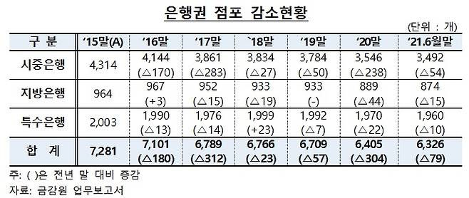 14일 금융감독원에 따르면, 6월말 기준 국내은행 점포수는 6326개로 전년 말(6405개) 대비 79개 감소했다.