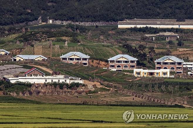 (파주=연합뉴스) 임병식 기자 = 14일 경기도 파주시 오두산 통일전망대에서 바라본 북한 황해북도 개풍군에서 주민들이 농사일을 하고 있다. 2021.9.14