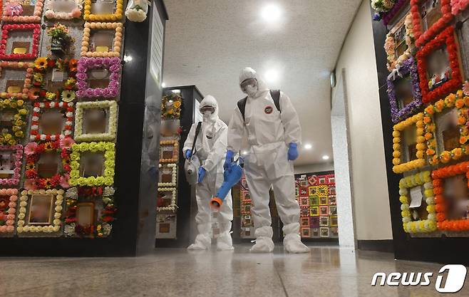 (수원=뉴스1) 김영운 기자 = 14일 오전 경기도 수원시 영통구 수원시연화장 추모의집에서 수원도시공사 직원들이 방역 작업을 하고 있다. 수원시연화장은 9월 6일부터 10월 10일까지 사전 예약제로 추모객들을 받으며 미예약자들은 입장 가능 인원수에 따라 입장에 제한이 있을 수 있다. 2021.9.14/뉴스1